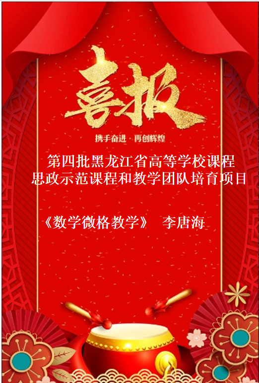 近日,黑龙江省教育厅公布黑龙江省高等学校第四批课程思政示范课程和教学团队培育项目、第二批课程思政优秀教学案例遴选结果,我院李唐海教授申报的《数学微格教学》课程获批省课程思政示范课程和教学团队培育项目。