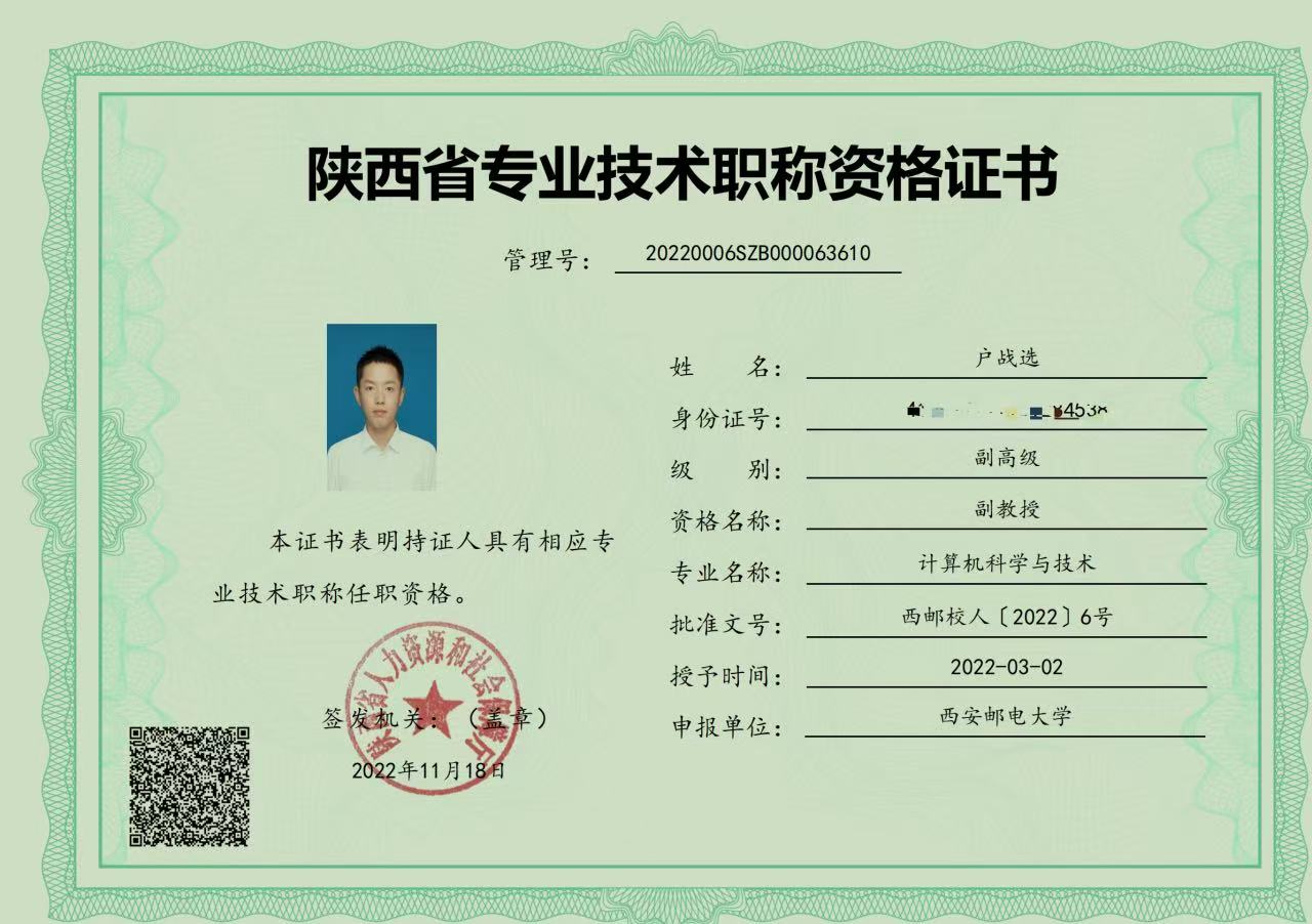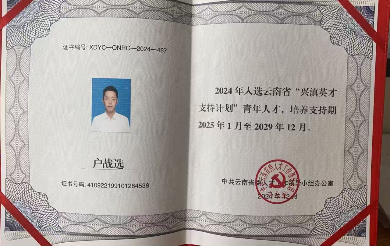 2021年7月,户战选凭博士期间的科研成果,以人才引进身份入职西安邮电大学计算机学院,直评副教授;2022年3月,正式取得计算机科学与技术专业副高级资格证书。2024年2月,他再获认可,以人才引进加入云南师范大学信息学院,并入选云南省“兴滇英才支持计划”青年人才,职业发展持续进阶。