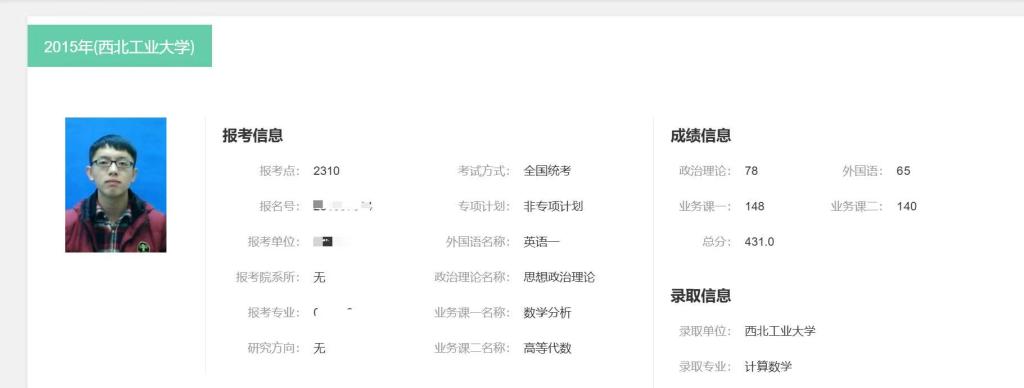 2015年,户战选以坚定目标投入考研备考,终日扎根图书馆钻研知识点、攻克真题。最终凭借思想政治理论78分、英语一65分、数学分析148分、高等代数140分,总分431分的优异成绩,在全国统考中突围,成功考入西北工业大学理学院计算数学专业,从师院课堂迈向更高学术平台。