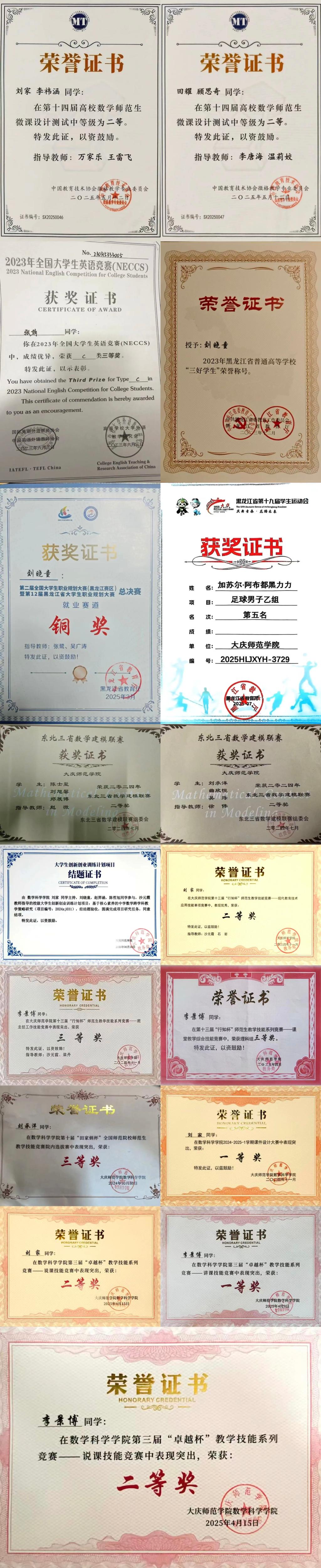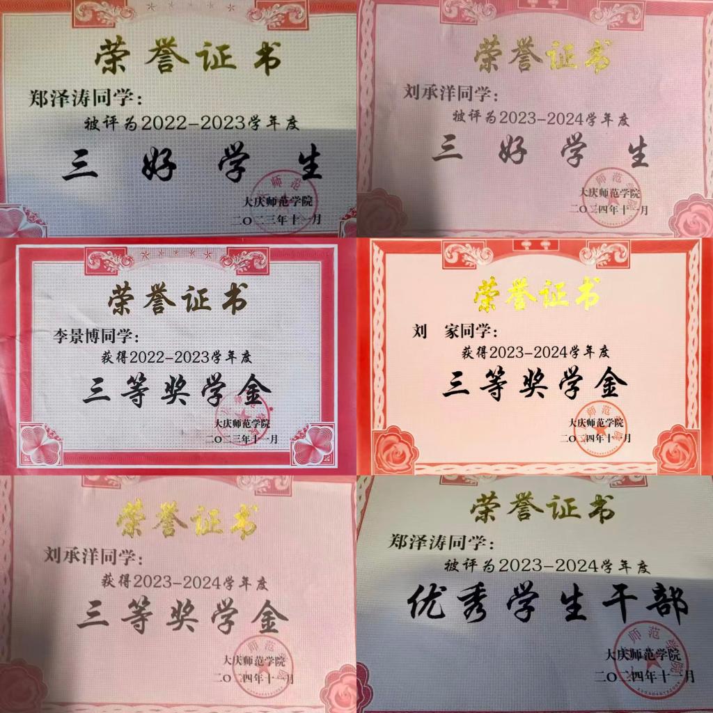 班级以“有条件要上,没有条件创造条件也要上”的铁人干劲狠抓学风,搭建“班委带头学、尖子生帮扶学、小组抱团学”的互助机制,营造比学赶超的浓厚氛围。班级学子在各类竞赛赛场佳绩频传,先后斩获全国大学生职业规划大赛黑龙江赛区铜奖、黑龙江省“三好学生”荣誉称号、第十四届高校数学师范生微课设计二等奖、黑龙江省大学生运动会足球第五名、全国大学生数学竞赛省一、二等奖、全国大学生英语竞赛省级三等奖以及中国国际大学生创新大赛(2025)黑龙江赛区铜奖,刘晓童、加苏尔·阿布都黑力力等同学在省级以上赛事中屡创佳绩,尽显青春风采与铁人精神风貌。