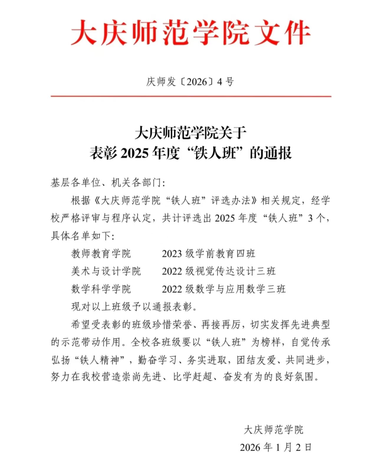此次获评“铁人班”,是对2022级数学三班全体同学的肯定与激励。未来,班级将以这份荣誉为新起点,继续传承和发扬铁人精神,在学业钻研中勇攀高峰,在实践奉献中增长才干,以青春之我、奋斗之我书写更加绚丽的成长篇章,为学校高质量发展贡献青春力量!(撰稿:马金娜 审核:夏丽娜 编辑:闫炎)