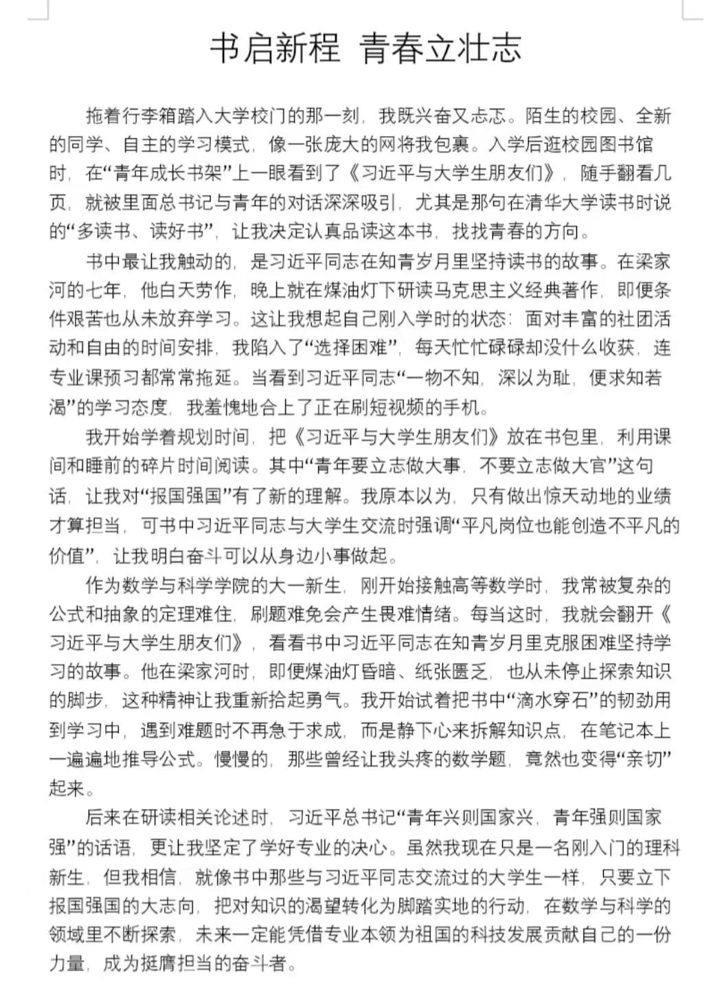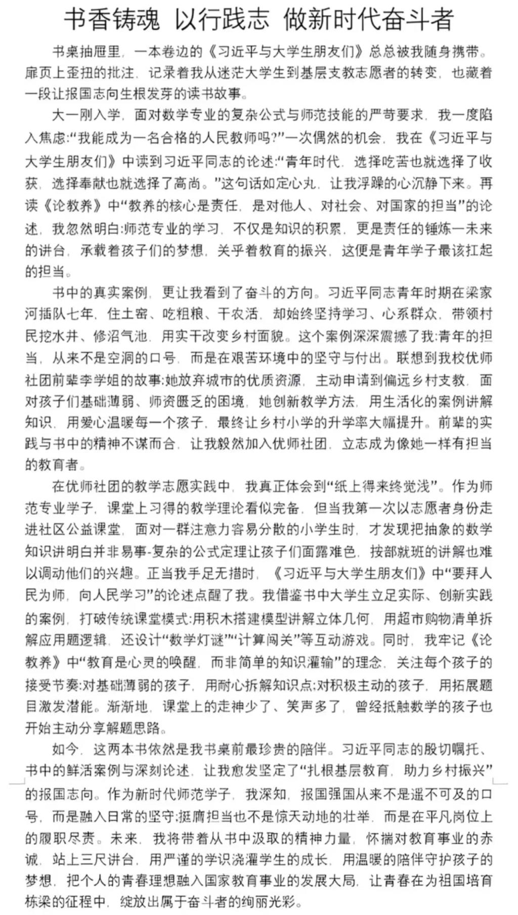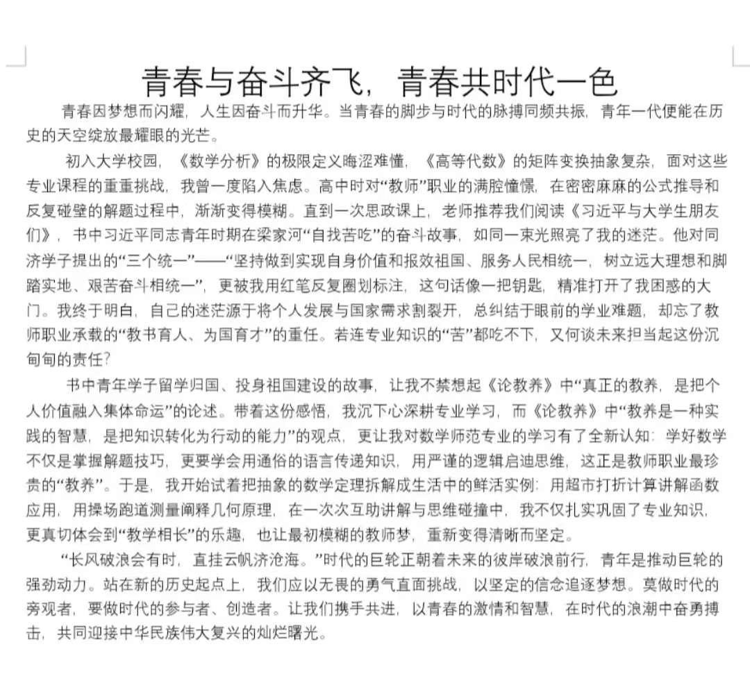 为深入贯彻落实习近平文化思想和全国教育大会精神,引导同学们坚定理想信念,williamhill英国于11月21日至24日开展“立报国强国大志向 做挺膺担当奋斗者”征文活动。旨在通过文字激发同学们的家国情怀,推动青春理想融入时代洪流。williamhill英国全体同学参加。活动期间,同学们结合自身经历挖掘创作素材,深耕红色记忆、厚植家国情怀,以文字记录感悟思考,进一步深化对红色文化、时代精神的理解,字里行间饱含对国家的感恩之情与青年担当之志。经过层层筛选与反复打磨,四篇优秀作品从众多投稿中脱颖而出。同学们纷纷表示,此次征文活动不仅助力自身提升综合素养,锤炼文字表达与逻辑思维能力,更坚定文化自信,有效营造积极向上的校园文化氛围。