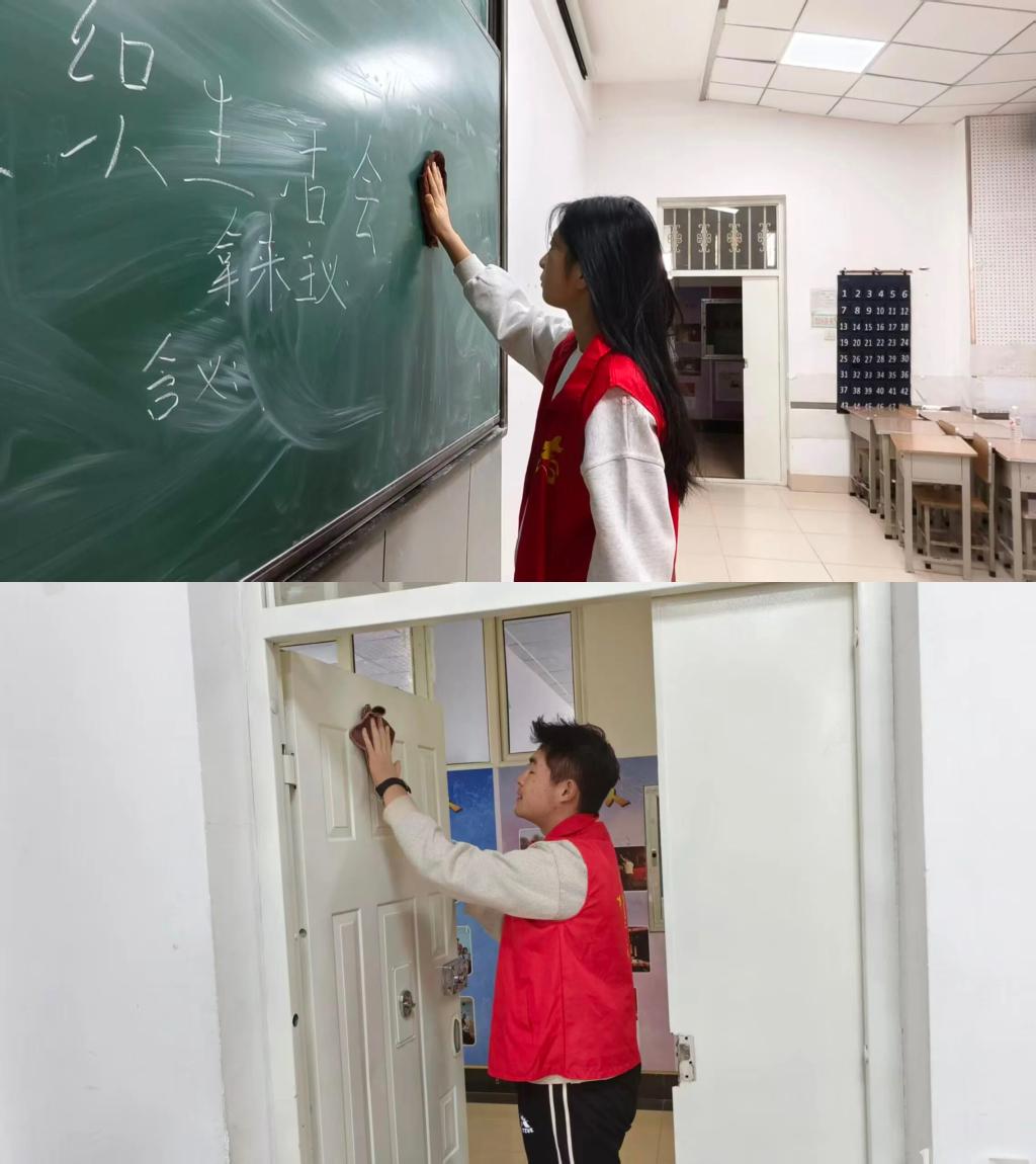 活动筹备阶段,志愿者们在系楼门口等区域有序发放主题传单,向学生讲解国际志愿者日的意义与本次清扫活动的目标。活动开始后,志愿者们统一身着志愿红马甲,在负责人的统筹下分组分工,迅速投入清扫工作。一组志愿者重点清洁公共区域,擦拭黑板,清理粉笔槽及相关设施。另一组志愿者负责地面与边角清理,他们手持扫帚沿着墙角进行“地毯式”清扫,着重清理楼梯转角、教室门口等卫生死角,确保环境整洁。活动过程中,志愿者们相互协作、配合默契,以认真负责的态度为改善学习环境贡献力量。