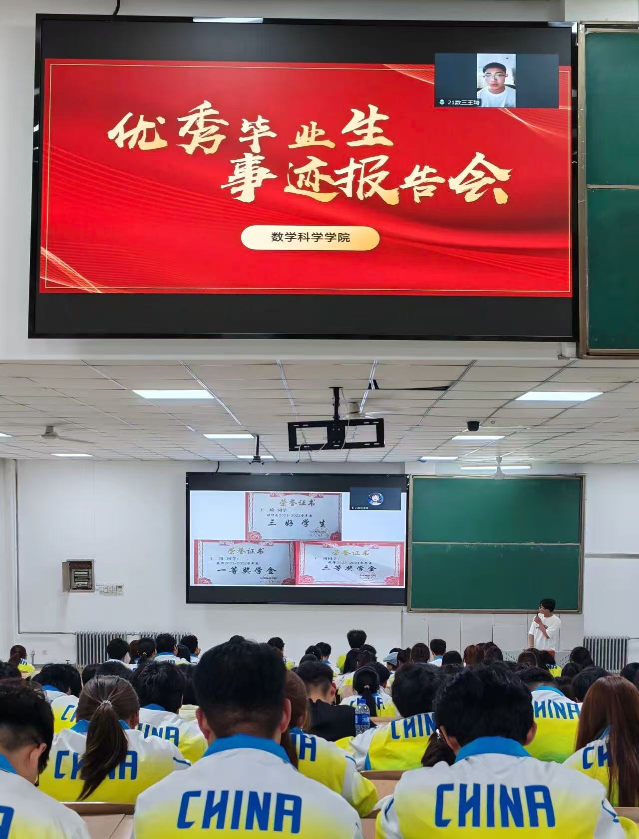 为充分发挥优秀毕业生的榜样引领作用,激发同学们的学习热情与奋斗动力。williamhill英国于6月16日在学院113教室开展“数海求知砺志,志愿献爱暖心”优秀毕业生事迹报告会,2024级全体学生参会,21级优秀毕业生王琦以线上形式,向学弟学妹们分享自己的奋斗历程与成长经验,传递榜样力量。