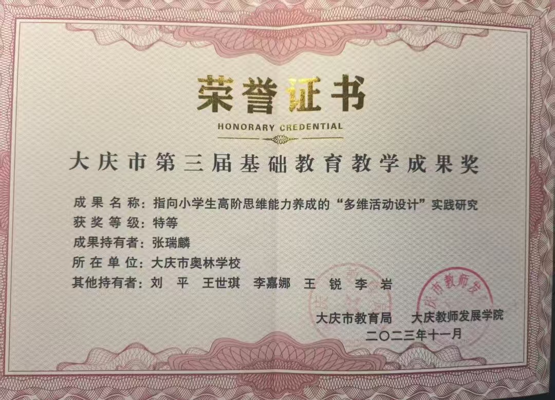 他的履历满是亮眼印记:大庆市高级人才、大庆市中小学教学名师、“十百千”教学能手,兼任大庆市社会科学界联合会教育学学术骨干、小学数学兼职教研员、市教科所兼职研究员,更是全国新世纪小学数学评审专家、教育部信息技术与学科融合大赛评审专家。奖项方面,他斩获大庆市第三、四届基础教育教学成果奖特等奖、全国信息技术与学科融合赛课一等奖2024年全省基础教育教师能力素质提升计划市级竞赛小学赛项材料评审特等奖等诸多荣誉,还著有专著、发表多篇获奖论文,指导教师成长并主讲全省核心素养示范课,成为同行学习的榜样。