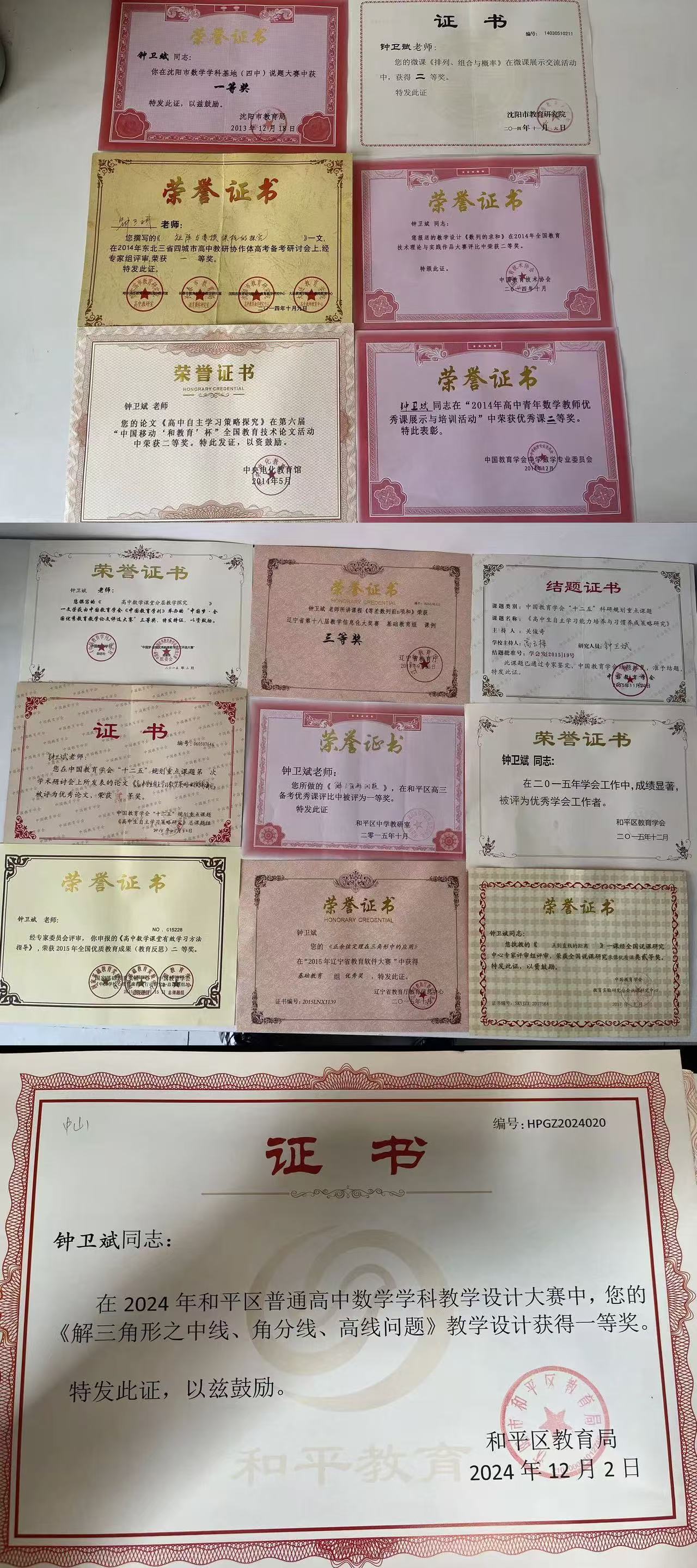 2013年,钟卫斌入职东北中山中学,正式开启数学教学生涯。他迅速将理论与实践结合,在教学竞赛中崭露头角——入职首年便获“沈阳市说课大赛一等奖”,此后接连斩获“全国优质教育成果二等奖”、“区教研组教学活动竞赛一等奖”等多项荣誉。十余年来,他深耕教学一线,先后被评为“区教育系统先进教师”、“区先进教育工作者”,用严谨的教学态度与出色的课堂效果,赢得学生与同事的广泛认可。