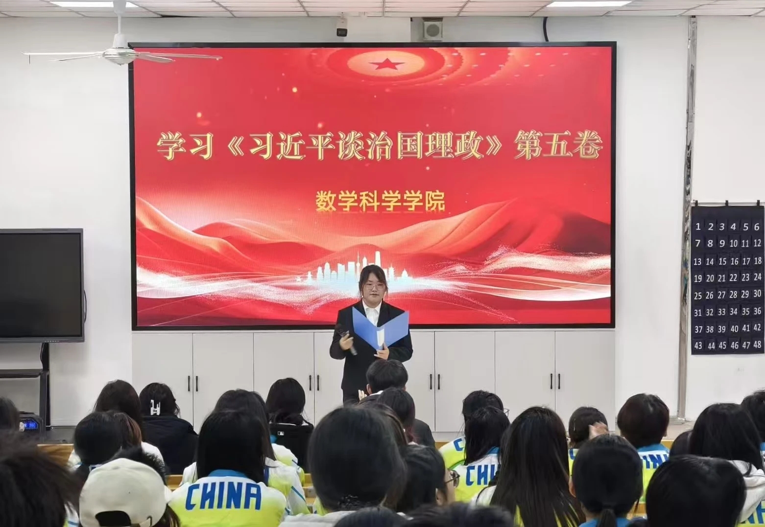 活动伊始,主持人介绍学习活动背景意义,强调要学深悟透《习近平谈治国理政》第五卷对青年的重要价值。随后四位宣讲人系统阐释核心要义与实践要求,聚焦“两个结合”、中国式现代化、“人民至上”、“新质生产力”等关键内容。最后两位同学分享了她们的读书心得,阐释了成长之道,并点亮了前行征程。同学们深刻认识到,《习近平谈治国理政》第五卷作为奋进新征程的强大思想武器,系统展现了马克思主义中国化时代化的最新成果。并且纷纷表示将以此次学习为起点,坚持读原著、学原文、悟原理,把理论学习成果转化为学习钻研的动力,服务社会的担当。
